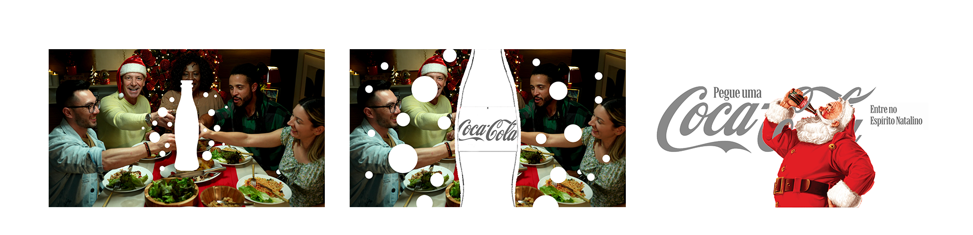 da identidade da Coca-Cola, campanhas atuais e históricas da marca, além de símbolos natalinos, sempre reforçando